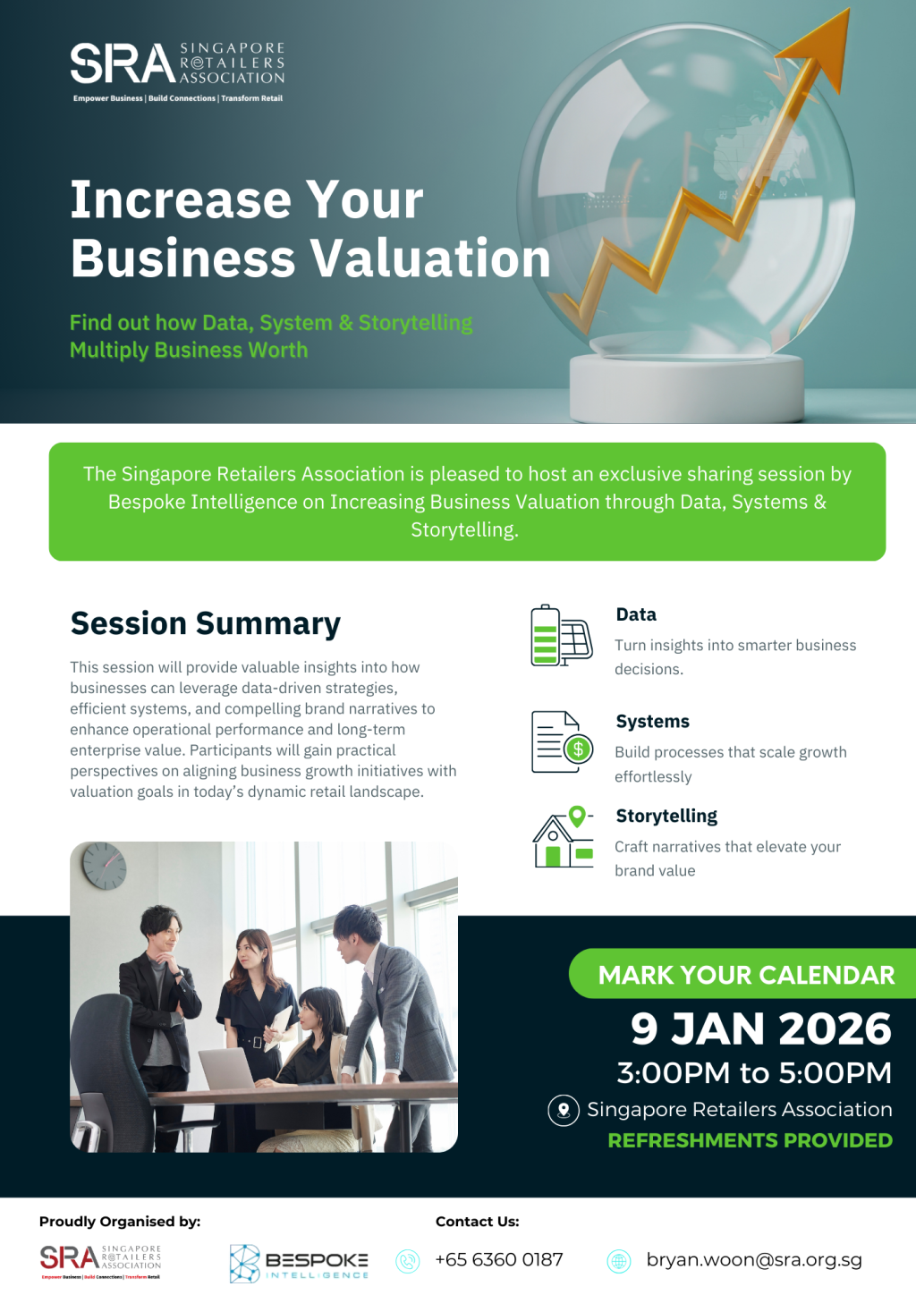 The Singapore Retailers Association is pleased to host an exclusive sharing session by Bespoke Intelligence on Increasing Business Valuation through Data, Systems & Storytelling.